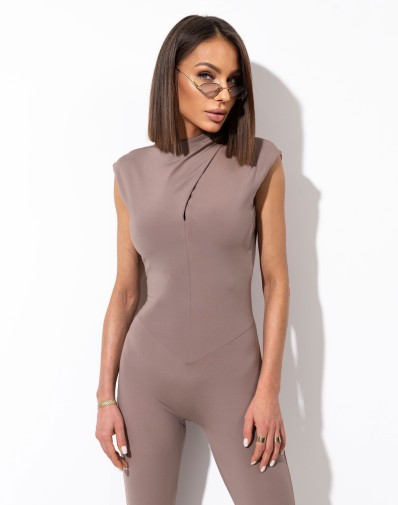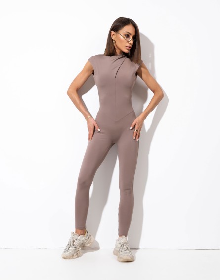 Dopasowany kombinezon na grubych ramiączkach i o długiej nogawce .Model wyróżnia się wyciętymi plecami oraz subtelnym wycięciem na dekolcie-nadając całości lekkości i nowoczesnego charakteru.Przód wykonany z podwójnej warstwy materiału zapewnia lepsze dopasowanie i estetyczne wykończenie .Prosty ale wyrazisty fason ,który idealnie dopasowuje się do sylwetki tworząc sportowo-modowe stylizacje.