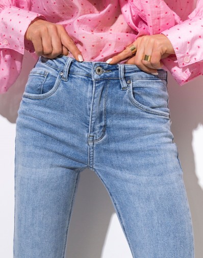 Jeansowe spodnie z wysokim stanem w jasnym niebieskim kolorze. Dopasowane w biodrach i udach, lekko rozszerzane ku dołowi. Zapinane klasycznie z kieszeniami. Wykonane z elastycznego denimu, który ładnie podkreśla sylwetkę i zapewnia komfort noszenia na co dzień.