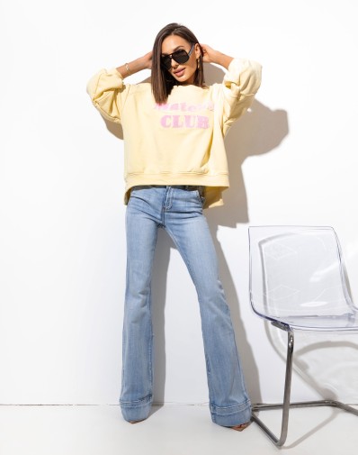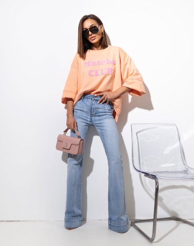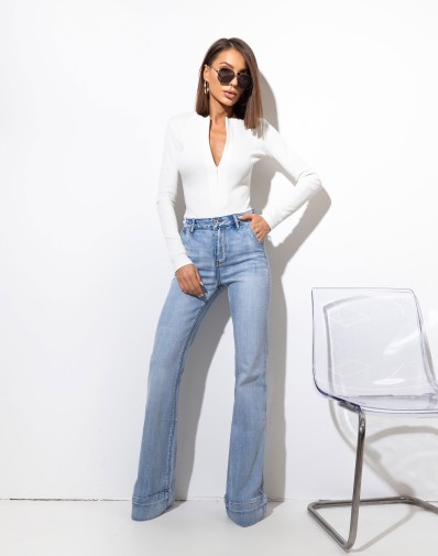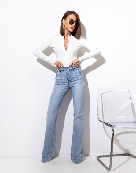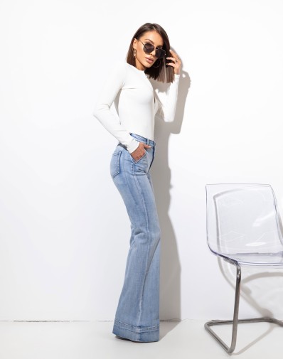 Jeansowe dzwony z szerokim mankietem wykonane z wysokiej jakości denimu. Model dopasowany w talii i na udach, który podkreśla sylwetkę i zapewnia komfort noszenia. Nogawki rozszerzane od kolana, zakończone szerokim mankietem, nadają całości wyrazistego charakteru i optycznie wydłużają nogi.Fason inspirowany stylem retro, doskonały zarówno do eleganckich, jak i codziennych stylizacji.