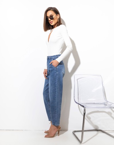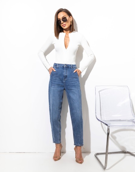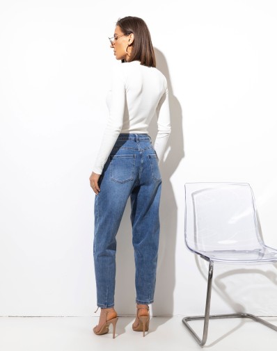 Spodnie jeansowe , wykonane z elastycznego materiału. To model z wysokim stanem, zapinany na guzik i suwak. Zarówno z przodu, jak i tyłu znajdują się funkcjonalne kieszenie. Wąska talia. Zaokrąglone nogawki zwężane u dołu, Wysoki stan. Swobodny fajny dżinsowy look. Idealne do codziennych stylizacji – od sneakersów po szpilki.