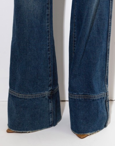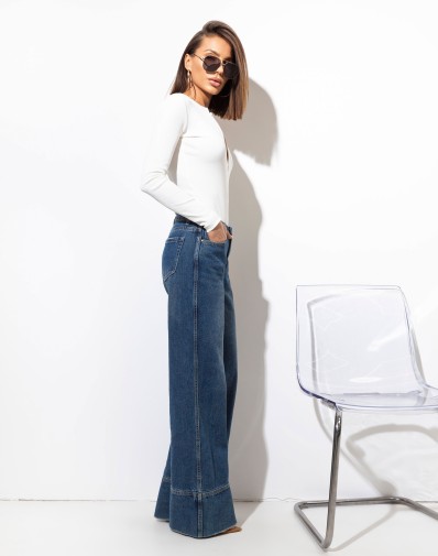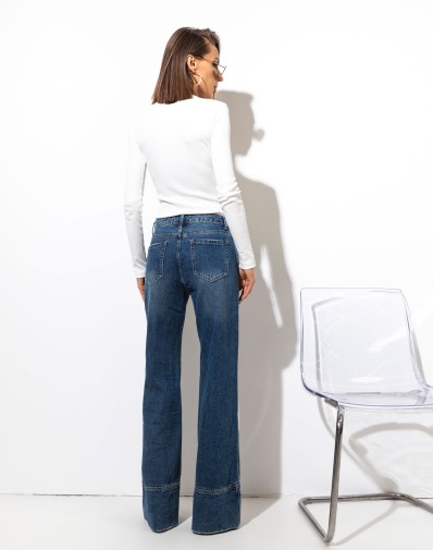 Stylowe jeansy o prostym kroju z szeroką nogawką to must-have w każdej garderobie. Wysoki stan pięknie podkreśla talię, a klasyczny, lekko sprany denim nadaje im ponadczasowego charakteru. Model zapinany na guzik i zamek, z praktycznymi kieszeniami z przodu i z tyłu.Wyjątkowym elementem jest szeroki mankiet na dole nogawki, który nadaje spodniom nowoczesnego, modowego wykończenia i optycznie wydłuża sylwetkę. Ten detal sprawia, że model wyróżnia się na tle klasycznych jeansów i świetnie prezentuje się zarówno ze sneakersami, jak i z botkami czy szpilkami.