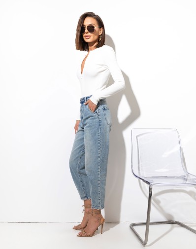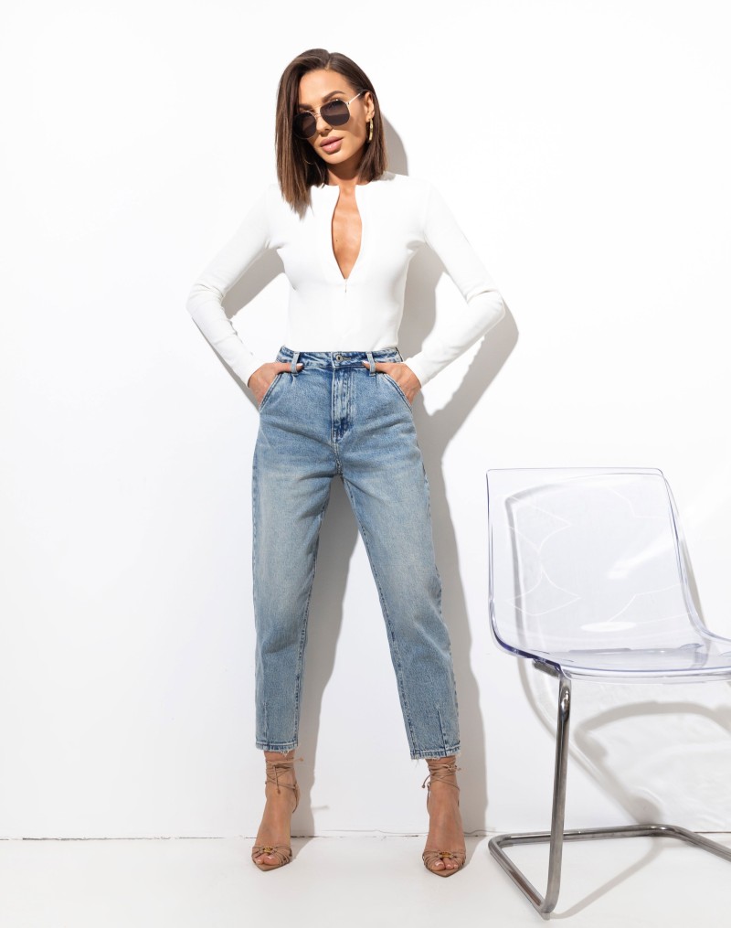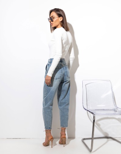 Spodnie jeansowe , wykonane z elastycznego materiału. To model z wysokim stanem, zapinany na guzik i suwak. Zarówno z przodu, jak i tyłu znajdują się funkcjonalne kieszenie. Wąska talia. Zaokrąglone nogawki zwężane u dołu, Wysoki stan. Swobodny fajny dżinsowy look. Idealne do codziennych stylizacji – od sneakersów po szpilki.
