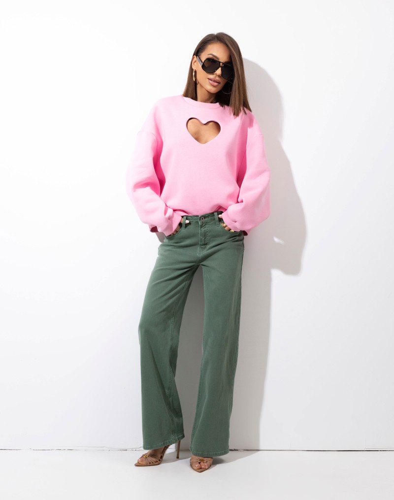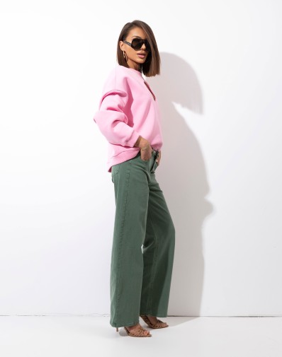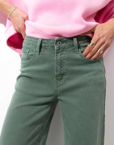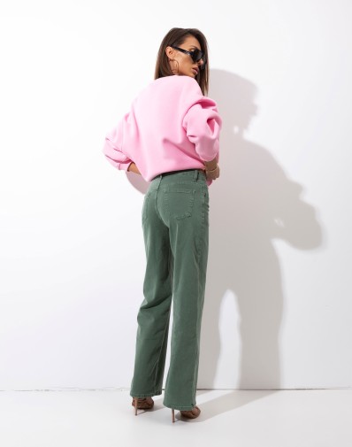 Spodnie zielone ,jeansowe o fasonie z prostą nogawką, wykonane z elastycznego dżinsu. To model z wysokim stanem, zapinany na guzik i suwak. Zarówno z przodu, jak i tyłu znajdują się funkcjonalne kieszenie. Wysoki stan pięknie podkreśla talię, a szerokie nogawki optycznie wydłużają sylwetkę i dodają nonszalanckiego luzu.Idealne do codziennych stylizacji – od sneakersów po szpilki.