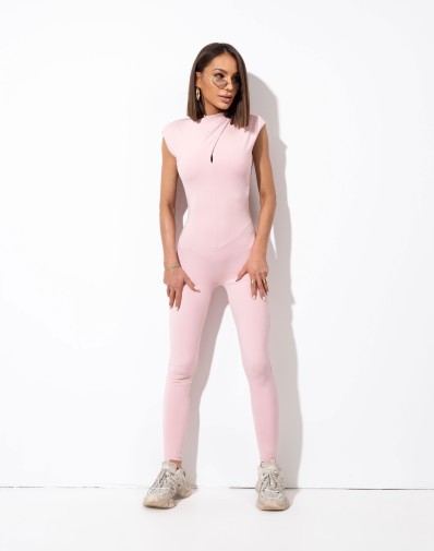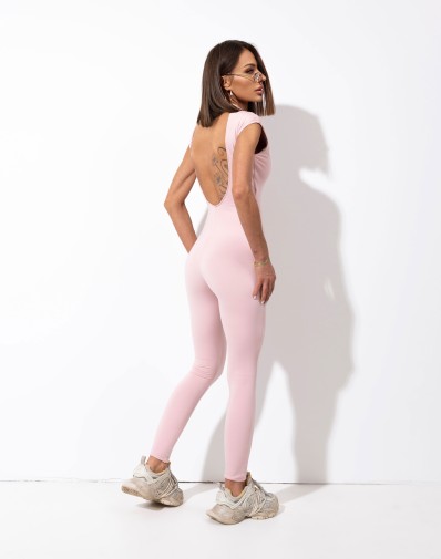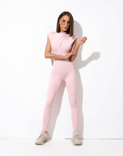 Dopasowany kombinezon na grubych ramiączkach i o długiej nogawce .Model wyróżnia się wyciętymi plecami oraz subtelnym wycięciem na dekolcie-nadając całości lekkości i nowoczesnego charakteru.Przód wykonany z podwójnej warstwy materiału zapewnia lepsze dopasowanie i estetyczne wykończenie .Prosty ale wyrazisty fason ,który idealnie dopasowuje się do sylwetki tworząc sportowo-modowe stylizacje.