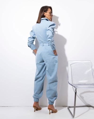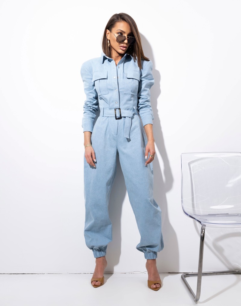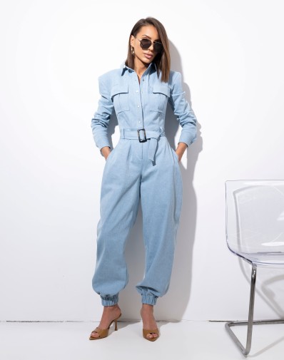 Kombinezon bawełniany z jasnego jeansu to stylowa i wygodna propozycja na co dzień. Model z długimi rękawami i nogawkami zakończonymi ściągaczami świetnie podkreśla sylwetkę, a poduszki w ramionach dodają mu modowego charakteru. Zapinany na zamek i napy, z klasycznym kołnierzem oraz praktycznymi kieszeniami po bokach i na wysokości biustu.W talii szlufki oraz pasek. Idealny do casualowych i bardziej kobiecych stylizacji.