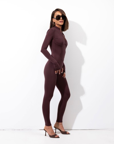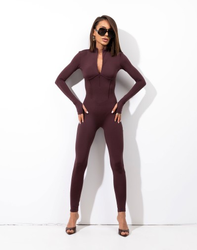 Elegancki, dopasowany kombinezon w kolorze cappuccino. Wykonany z elastycznego, gładkiego materiału, który podkreśla sylwetkę i zapewnia komfort noszenia. Długie rękawy oraz subtelne przeszycia modelujące w talii i na biuście nadają mu nowoczesny, minimalistyczny charakter. Idealny zarówno na specjalne okazje, jak i stylowe, codzienne stylizacje.