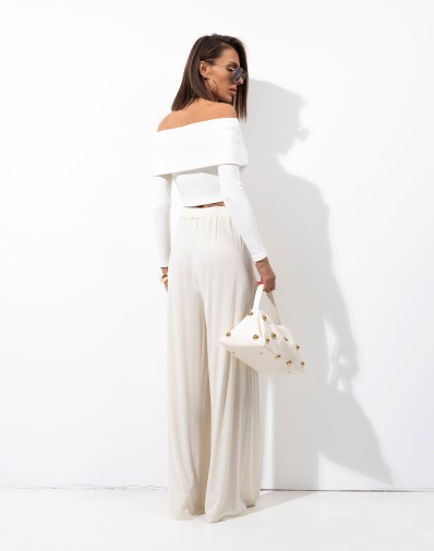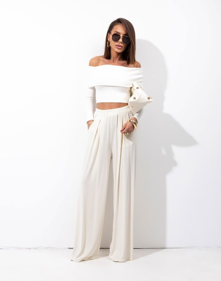 Szerokie, luźne spodnie z wygodną gumką w pasie, która zapewnia komfort noszenia i dobre dopasowanie do sylwetki. Model posiada praktyczne kieszenie po bokach oraz delikatne zakładki z przodu, które dodają elegancji i ładnie układają się na figurze. Szerokie, swobodnie opadające nogawki nadają spodniom modny charakter i sprawiają, że są idealne zarówno do codziennych, jak i bardziej stylowych stylizacji.