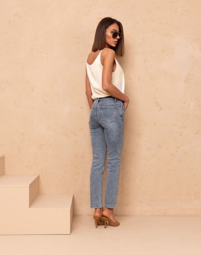 Spodnie jeansowe o fasonie z wąską nogawką, wykonane z miękkiego dżinsu. To model z wyższym stanem, zapinany na guzik i suwak. Zarówno z przodu, jak i tyłu znajdują się funkcjonalne kieszenie. Wysoki stan pięknie podkreśla talię,w zestawie ozdobna szarfa.Idealne do codziennych stylizacji – od sneakersów po szpilki.