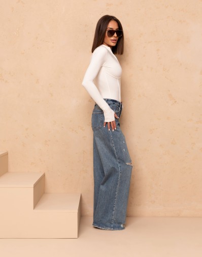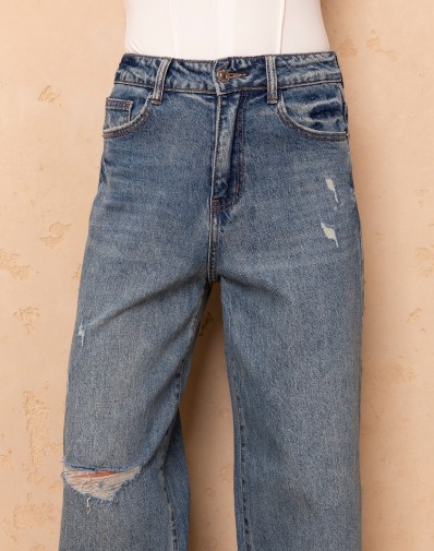 Luźne, wygodne jeansy wykonane z miękkiego denimu o lekko spranym wykończeniu.Model z szeroką nogawką i efektownymi przetarciami, które nadają całości swobodny, miejski charakter.Wysoki stan podkreśla talię, a prosty krój optycznie wydłuża nogi.Idealne do codziennych stylizacji – świetnie wyglądają z oversize swetrem, t-shirtem lub krótkim topem.