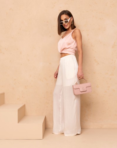 Lekkie i zwiewne spodnie o szerokiej nogawce w odcieniu ecru, które łączą elegancję z komfortem noszenia. Wysoki stan pięknie podkreśla talię, a delikatny, półtransparentny materiał nadaje stylizacji subtelności i lekkości. Idealne zarówno do codziennych stylizacji, jak i bardziej eleganckich wyjść – świetnie komponują się z topami, koszulami i marynarkami.