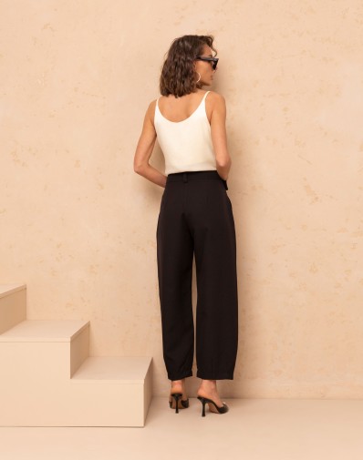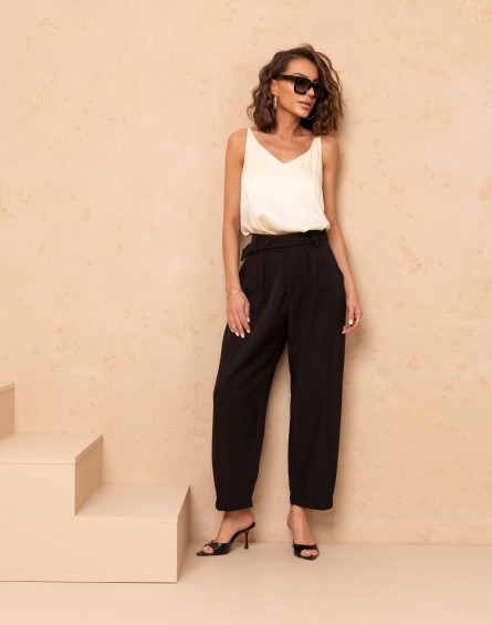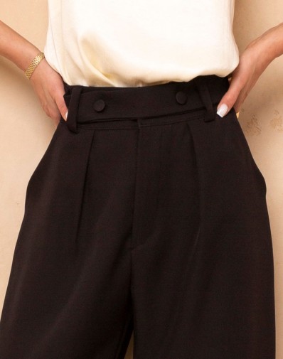 Eleganckie spodnie w klasycznej czerni , które łączą styl i wygodę. Wysoki stan pięknie podkreśla talię, a luźniejszy krój nogawek zapewnia swobodę ruchów i nowoczesny look. Zapinane na zamek i guzik, z praktycznymi zakładkami z przodu, świetnie sprawdzą się zarówno w eleganckich, jak i codziennych stylizacjach.