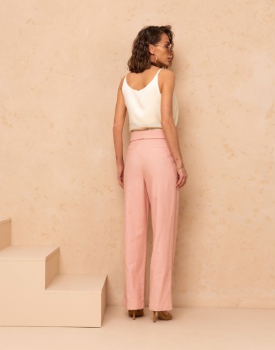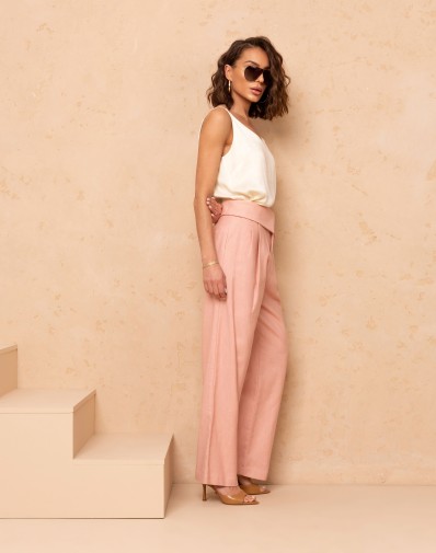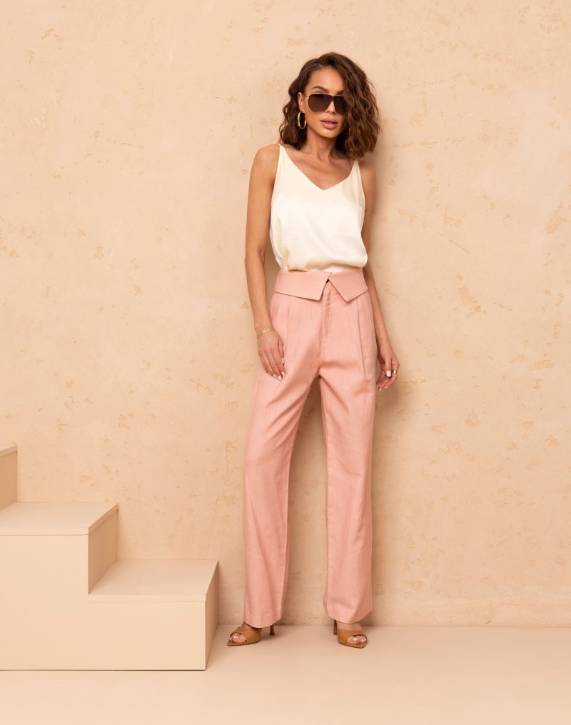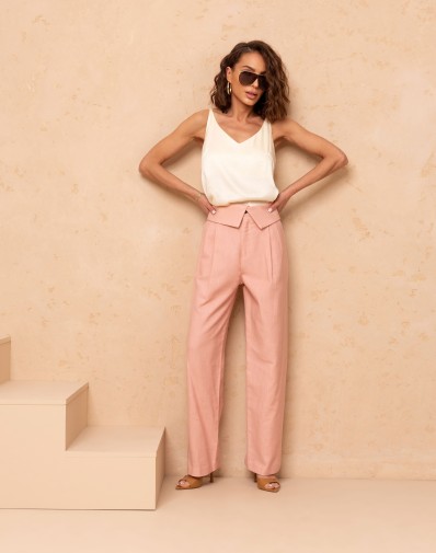 Eleganckie spodnie w pudrowym różu, które łączą styl i wygodę. Wysoki stan pięknie podkreśla talię a asymetryczne ułożenie ją wyszczupla, a luźniejszy krój nogawek zapewnia swobodę ruchów i nowoczesny look. Zapinane na zamek i guzik, z praktycznymi zakładkami oraz kieszeniami z przodu, świetnie sprawdzą się zarówno w eleganckich, jak i codziennych stylizacjach.