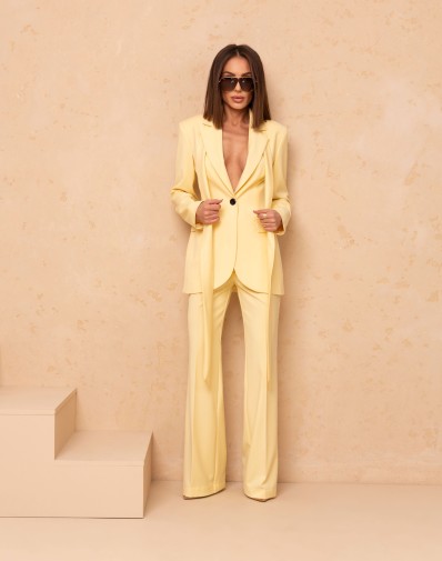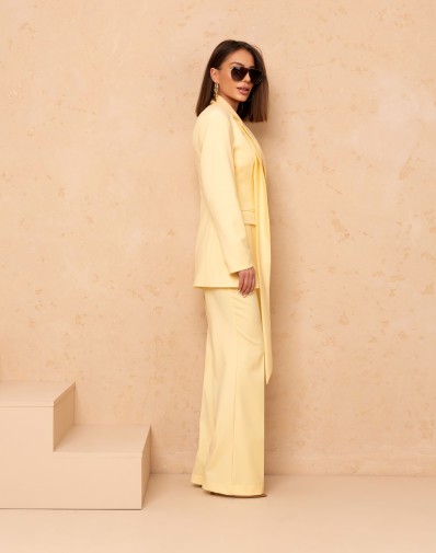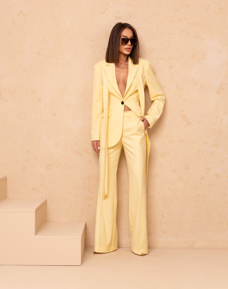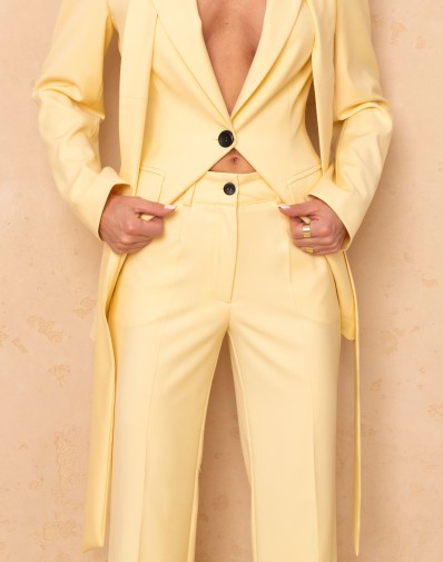 Spodnie z rozszerzaną nogawką. W pasie szlufki. Przód zapinany na klasyczne zapięcie. Z przodu wsuwane kieszenie. Z tyłu patki. Skompletujesz je z naszymi marynarkami z paskiem .