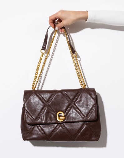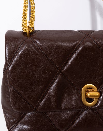 Elegancka torebka wykonana z miękkiej, ekologicznej skóry w głębokim, czekoladowym odcieniu. Klasyczne pikowanie w romby nadaje jej ponadczasowego charakteru, a złoty łańcuszek z regulacją dodaje szyku i subtelnego blasku. Model zamykany na stylowe, metalowe zapięcie, które podkreśla luksusowy design. Idealna zarówno do codziennych stylizacji, jak i na wyjątkowe okazje – łączy funkcjonalność z wyrafinowaną estetyką.