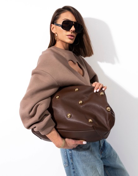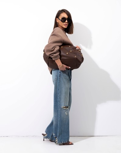 Elegancka torebka w głębokim, czekoladowym odcieniu brązu, wykonana z wysokiej jakości materiału o delikatnej fakturze. Ozdobne, złote elementy nadają jej nowoczesnego i wyjątkowego charakteru, dzięki czemu świetnie uzupełni zarówno codzienne, jak i bardziej eleganckie stylizacje. Wygodne uchwyty pozwalają na komfortowe noszenie na ramieniu, a pojemne wnętrze pomieści wszystkie najpotrzebniejsze rzeczy. To idealny wybór dla kobiet ceniących styl, funkcjonalność i ponadczasową elegancję.Zapinana na zamek , w środku kieszonki.