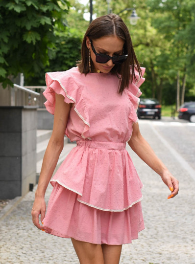 Bawełniana sukienka mini z asymetrycznym dołem. Przód i tył ozdobiony falbanami wykończonymi gipiurą. Motylkowe rękawy. Okrągły dekolt. W talii guma. Dziewczęcy fason, idealny na lato.