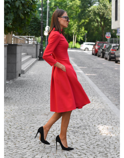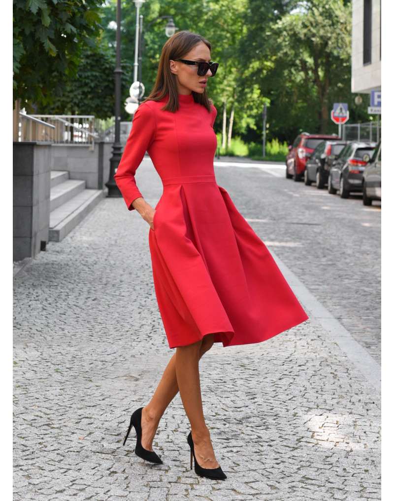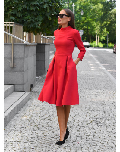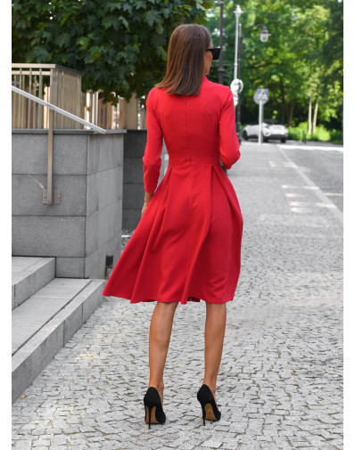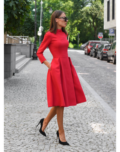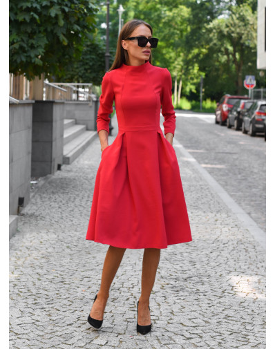 Elegancka sukienka z kontrafałdami i stójką. Materiał miękki i delikatnie elastyczny. Po bokach kieszenie. Rękaw 7/8. Tył zapinany na zamek kryty. Odcięcie w talii pięknie podkreśla kobiece kształty. Sukienka efektownie układa się w ruchu.