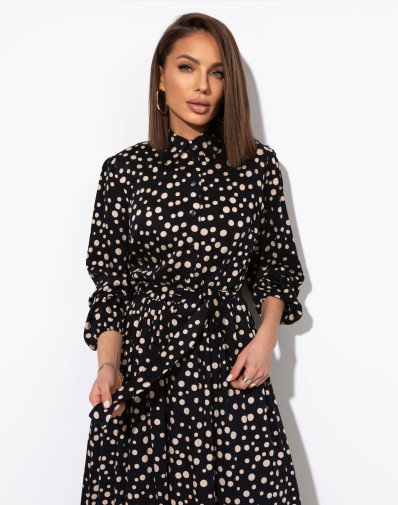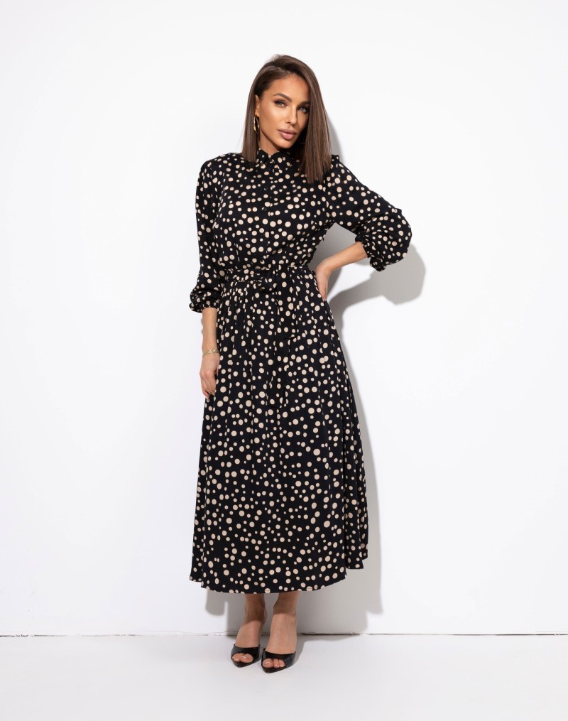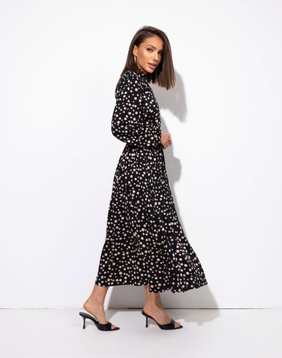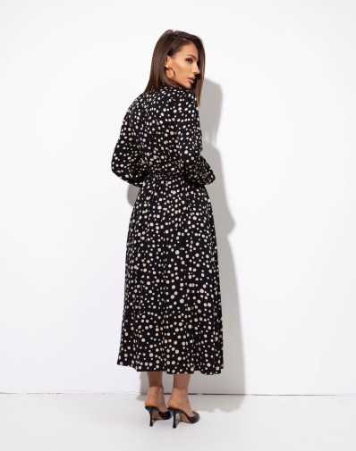 Midi sukienka wykonana z tkaniny wiskozowej.Zapinana po boku na kryty zamek.W komplecie pasek w tym samym wzorze.W pasie wszyta guma , idealnie podkreśla talię.Rękawy delikatnie bufiaste zakończone na gumce.Góra koszulowa zapinana na guziki , dół sukienki na tiulu oraz podszewce, co sprawia że sukienka pięknie się układa i nadaje jej kobiecego wdzięku.Podszewka wszyta od pasa w dół , chroniąc ciało przed tiulem.Idealna na specjalne,wizytowe okazje.