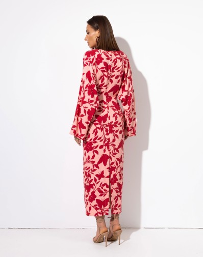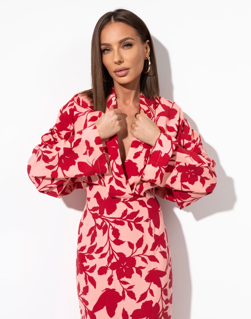 Sukienka midi z rozcięciem z tyłu na wysokości łydek to elegancka propozycja dla kobiet ceniących styl i wygodę. Góra sukienki ma formę kimono z szalowym kołnierzem, co nadaje jej lekkości i swobody. Sukienka zapinana jest na kryty zamek z tyłu, co zapewnia doskonałe dopasowanie. Połączenie kolorów – łososiowego z czerwienią – tworzy efektowny i modny akcent, idealny na różne okazje. To doskonały wybór dla osób szukających unikalnych elementów garderoby.