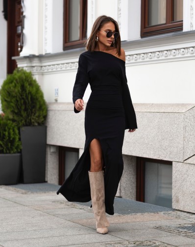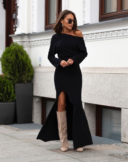 Sukienka o długości maxi i dopasowanym kroju. Góra w lekkiej formie kimono.Wykonana z elastycznej bawełny. Delikatnie drapowana w talii, sukienka prezentuje się niezwykle kobieco, a rozszerzany dół z efektownym rozcięciem odsłaniającym nogę dodaje jej charakteru i seksapilu. Opadające ramię nadaje całości lekkości i swobody, tworząc unikalny, modny wygląd.Sukienka nie jest podszywana, co nadaje jej surowego, nowoczesnego wykończenia. Idealna na wyjątkowe okazje oraz wieczorne wyjścia, z pewnością przyciągnie spojrzenia i sprawi, że poczujesz się wyjątkowo.Rękawy rozszerzane