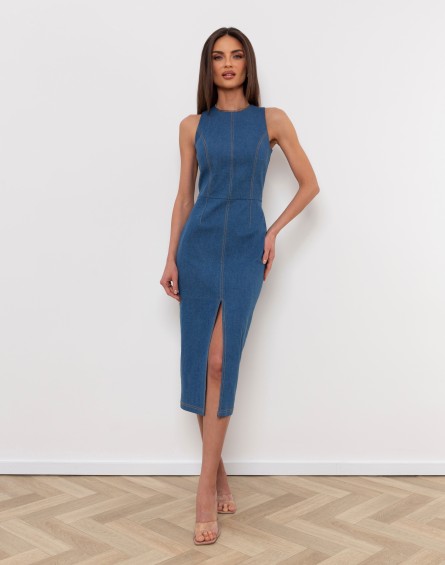 Stylowa jeansowa sukienka midi, idealna na różne okazje. Dopasowany krój podkreśla sylwetkę, a rozcięcie z przodu dodaje jej charakteru. Sukienka ma zaokrąglony dekolt oraz grube ramiączka, co zapewnia komfort noszenia. Z tyłu znajduje się kryty zamek, ułatwiający zakładanie. Całość została przeszyta żółtą nicią, co nadaje jej modny akcent. Idealna na wiosenne i letnie dni!