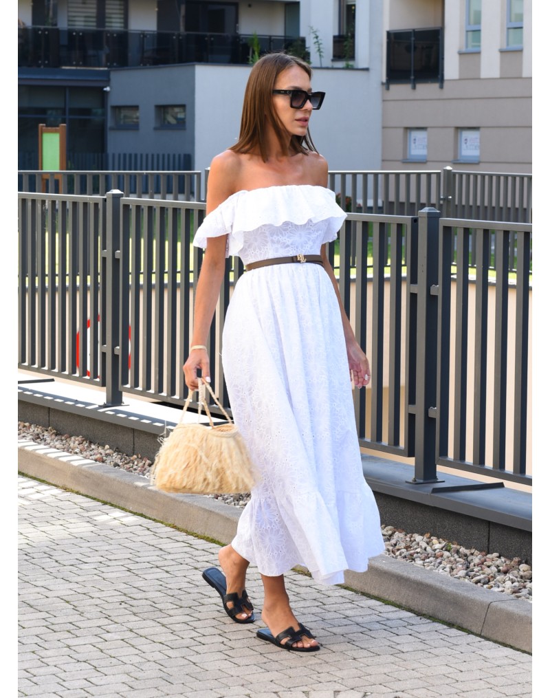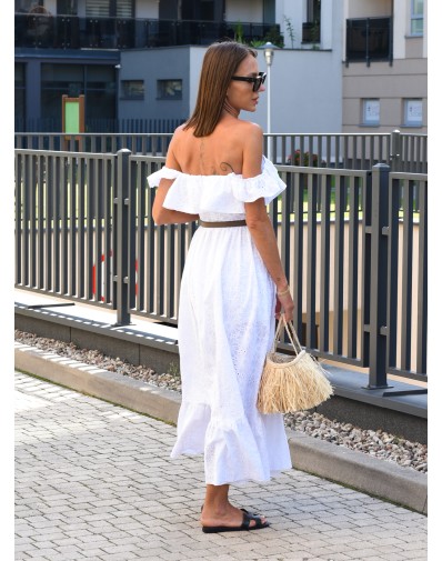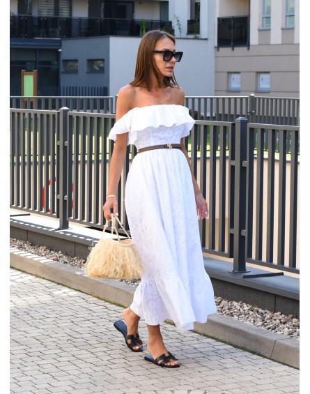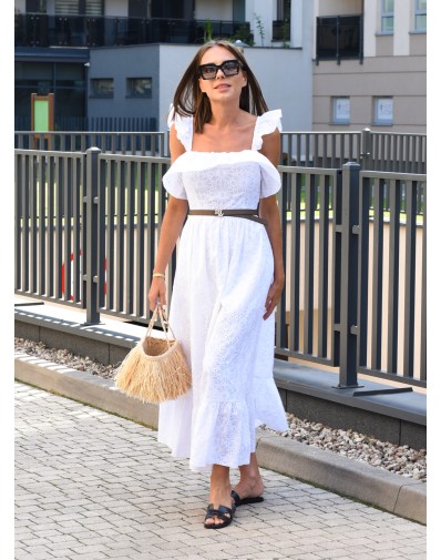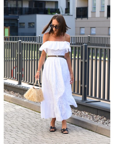 Model wykonany z przewiewnej, haftowanej tkaniny, która nadaje całości subtelnego uroku i delikatności. Elastyczna guma w pasie pięknie podkreśla talię, a falbana przy dekolcie nadaje sylwetce lekkości i hiszpańskiego charakteru.Zapinana z tyłu na zamek.Sukienkę możesz nosić na dwa sposoby – klasycznie opuszczoną na ramiona lub z ramionkami do góry, co pozwala dostosować ją do okazji. Kolor brudnego różu dodaje elegancji i sprawia, że kreacja idealnie sprawdzi się zarówno na co dzień, jak i na wakacyjne wyjazdy, randki czy letnie przyjęcia.