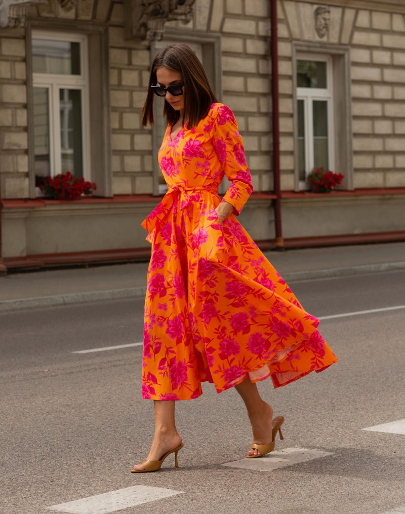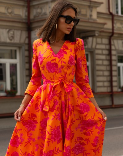Sukienka o tym kroju to stylowa propozycja na różne okazje. Posiada rękawy 3/4 oraz dekolt V co dodaje jej elegancji . Zamek kryty z tyłu zapewnia łatwe zakładanie.Przepięknie rozkloszowany dół , obłędnie układa się w ruchu. Idealna na letnie przyjęcia,casualowe wyjścia a nawet do pracy .