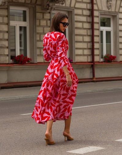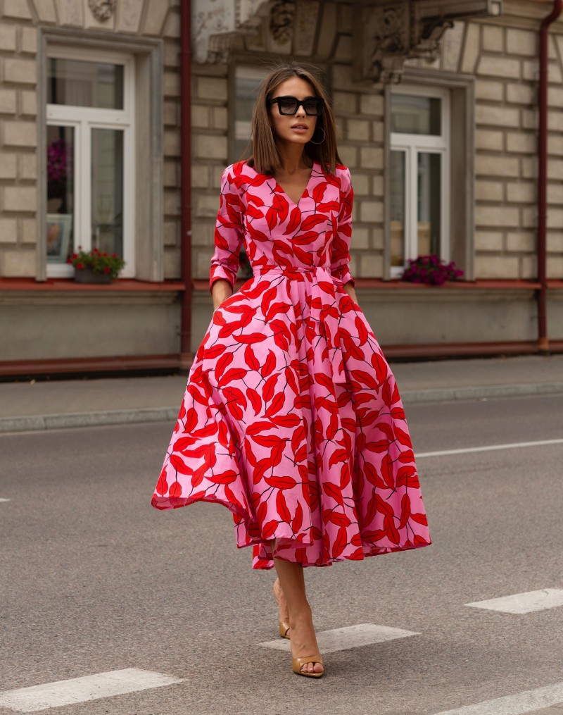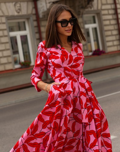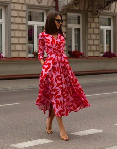 Sukienka o tym kroju to stylowa propozycja na różne okazje. Posiada rękawy 3/4 oraz dekolt V co dodaje jej elegancji . Zamek kryty z tyłu zapewnia łatwe zakładanie.Przepięknie rozkloszowany dół , obłędnie układa się w ruchu. Idealna na letnie przyjęcia,casualowe wyjścia a nawet do pracy .