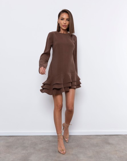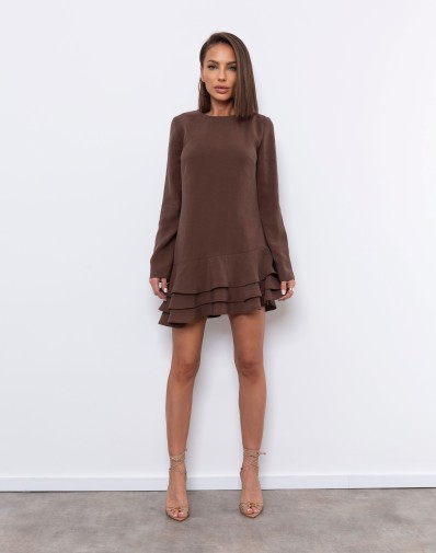 Sukienka o prostym kroju z subtelnym, eleganckim wykończeniem. Z tyłu zapinana na zamek, co ułatwia zakładanie. Dół ozdobiony trzema efektownymi falbankami, które nadają lekkości i dziewczęcego uroku. Zakończony delikatnie asymetrycznie – lekko na ukos, z dłuższym końcem z jednej strony. Idealna na wiele okazji – zarówno na co dzień, jak i na wieczorne wyjścia.