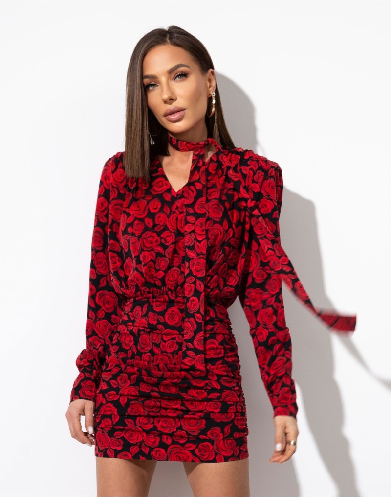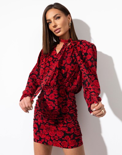 Sukienka o wyjątkowym princie w róże,wykonana z wysokiej jakości wiskozy.Subtelny dekolt V , marszczony dół,długi rękaw i szarfa,którą można wiązać na wiele sposobów.Zapinana na zamek kryty z tyłu , poduszki w ramionach.Sukienka idealna na wyjątkowe okazje -randkę ,imprezę , wyjście ze znajomymi lub inne ważne wyjście .