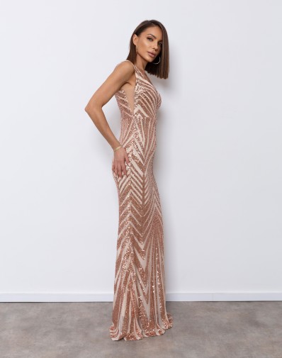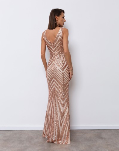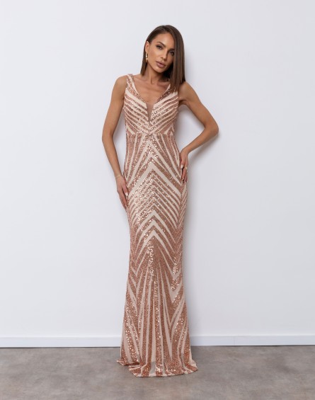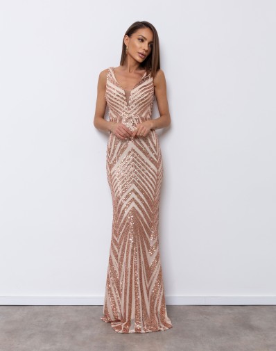 W SPRZEDAŻY 1.12 GODZ. 18:00 Elegancka długa sukienka wieczorowa, która zachwyca subtelnym połyskiem cekinów i perfekcyjnym krojem. Przód zdobi głęboki dekolt w kształcie litry V,dodający kreacji subtelnej zmysłowości.Tył sukienki również układa się w literę V i jest zapinany na zamek kryty co zapewnia komfort noszenia oraz idealne dopasowanie.Delikatnie rozszerza się ku dołowi, zapewniając lekkość i płynny, elegancki fason. Idealna propozycja na wyjątkowe