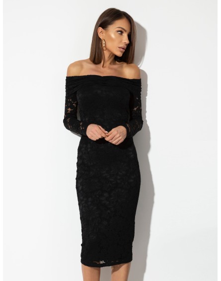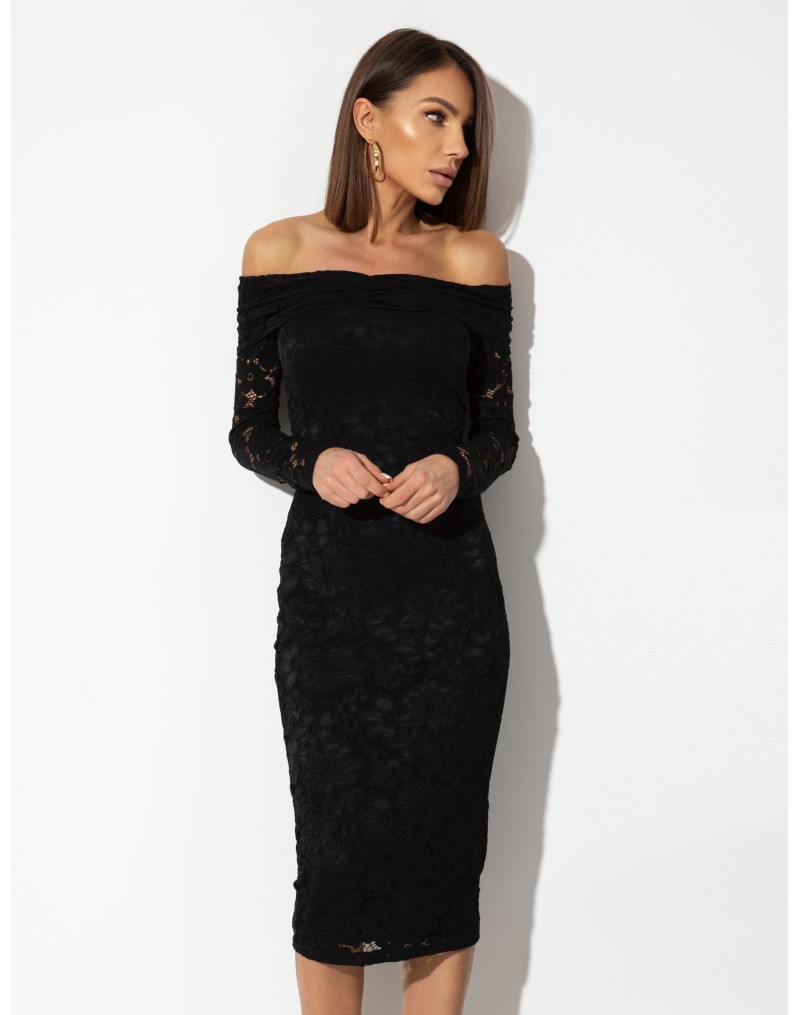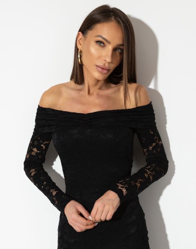 Sukienka midi z długim rękawem i odkrytymi ramionami w kolorze czarnym. Wykonana z koronki oraz podszewki. Góra typu hiszpanka,zapewnia stabilne dopasowanie i komfort noszenia. Długość midi nadaje jej eleganckiego charakteru.Idealna na ważne okazję,święta,imprezy.