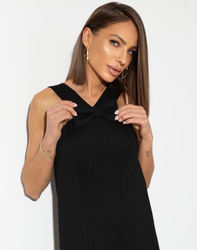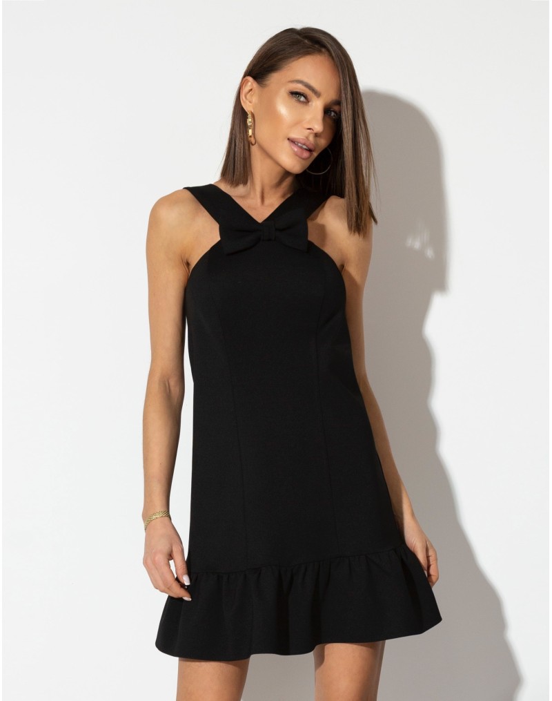 Elegancka czarna sukienka mini, wykonana z gładkiego, strukturalnego materiału, który pięknie układa się na sylwetce. Model wyróżnia się szerokimi ramiączkami krzyżującymi się przy dekolcie oraz subtelną kokardą, dodającą całości kobiecego uroku. Delikatnie rozkloszowany dół z falbaną nadaje lekkości i podkreśla nogi. Idealna na wieczorne wyjścia, przyjęcia lub eleganckie okazje.