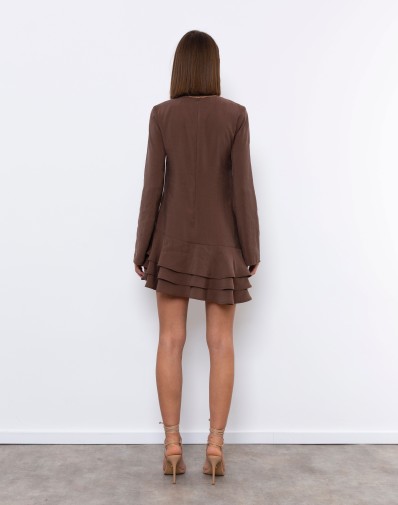 BRAK W TKANINIE Z TYŁU Sukienka o prostym kroju z subtelnym, eleganckim wykończeniem. Z tyłu zapinana na zamek, co ułatwia zakładanie. Dół ozdobiony trzema efektownymi falbankami, które nadają lekkości i dziewczęcego uroku. Zakończony delikatnie asymetrycznie – lekko na ukos, z dłuższym końcem z jednej strony. Idealna na wiele okazji – zarówno na co dzień, jak i na wieczorne wyjścia.