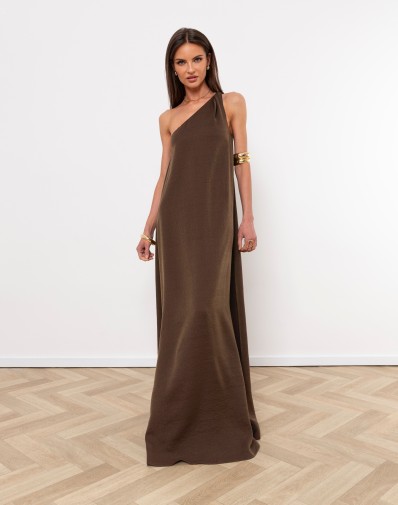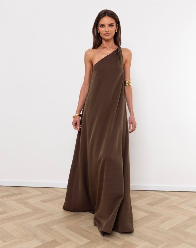 Sukienka maxi rozszerzana ku dołowi to elegancka i kobieca propozycja na różne okazje. Charakterystyczny fason z rozszerzanym dołem zapewnia wygodę i swobodę ruchów, jednocześnie podkreślając sylwetkę. Eleganckie jedno ramię z zakręconym ramiączkiem dodaje jej niepowtarzalnego charakteru i subtelnego uroku. Wykonana z lekkiej i przewiewnej wiskozy, jest idealna na ciepłe dni, zapewniając komfort przez cały dzień. Jednolity kolor sprawia, że sukienka łatwo wpisuje się w różne stylizacje, od casualowych po bardziej formalne. To doskonały wybór dla kobiet ceniących modę, wygodę i ponadczasową elegancję.