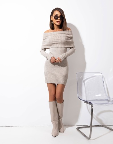 Dopasowana sukienka z elastycznego sweterkowego materiału, która podkreśla sylwetkę. Model 2w1 – golf możesz nosić luźno przy szyi lub opuścić na ramiona, tworząc kobiecy dekolt.Rękawy zakończone mankietem w wyrazisty prążek, identyczny jak dół sukienki i golf, nadają całości spójny i stylowy charakter.Miękka, elastyczna dzianina pięknie podkreśla sylwetkę i zapewnia komfort noszenia.