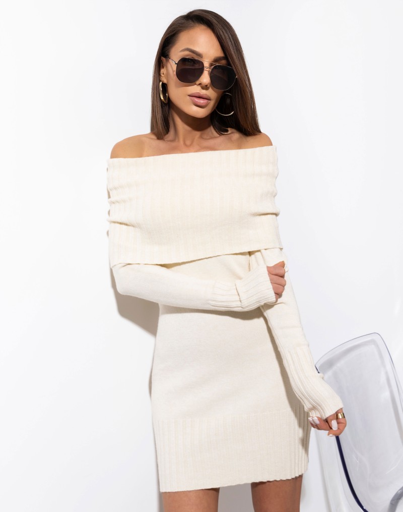 Dopasowana sukienka z elastycznego sweterkowego materiału, która podkreśla sylwetkę. Model 2w1 – golf możesz nosić luźno przy szyi lub opuścić na ramiona, tworząc kobiecy dekolt.Rękawy zakończone mankietem w wyrazisty prążek, identyczny jak dół sukienki i golf, nadają całości spójny i stylowy charakter.Miękka, elastyczna dzianina pięknie podkreśla sylwetkę i zapewnia komfort noszenia.