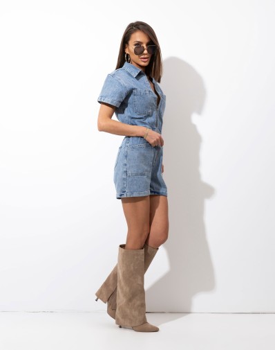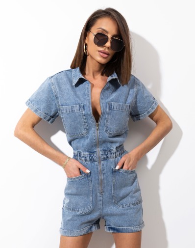 Jeansowy kombinezon zapinany na zamek z przodu to idealne połączenie wygody i miejskiego stylu. Model z klasycznym kołnierzykiem, krótkimi rękawami i nogawkami prezentuje się lekko i nowocześnie. Na przodzie znajdują się kieszenie na biuście oraz dodatkowe, funkcjonalne kieszenie z przodu i z tyłu na wysokości bioder. Wszyta w pasie guma pięknie podkreśla talię i zapewnia komfort noszenia przez cały dzień. To doskonała baza do stylizacji – wystarczy dobrać sneakersy lub wysokie buty, by stworzyć modny look