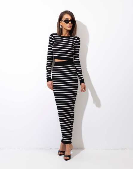 Stylowy komplet składający się z krótszej, dopasowanej bluzki z długim rękawem oraz spódnicy maxi na wygodnej gumce. Wykonany z mięsistego,elastycznego, przyjemnego w dotyku materiału, który pięknie układa się na sylwetce. Klasyczny wzór w czarno-białe paski nadaje całości ponadczasowego charakteru i sprawia, że zestaw przyciąga spojrzenia. To idealna propozycja zarówno na co dzień, jak i na bardziej eleganckie wyjścia – wystarczy zmienić dodatki, by stworzyć zupełnie nową stylizację.