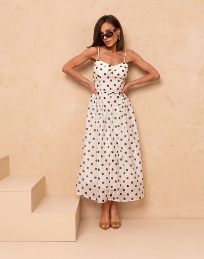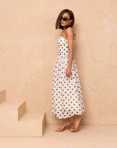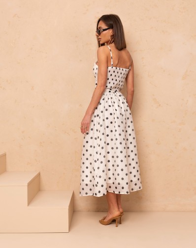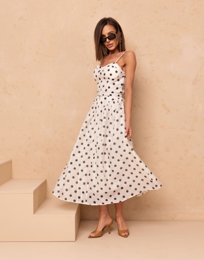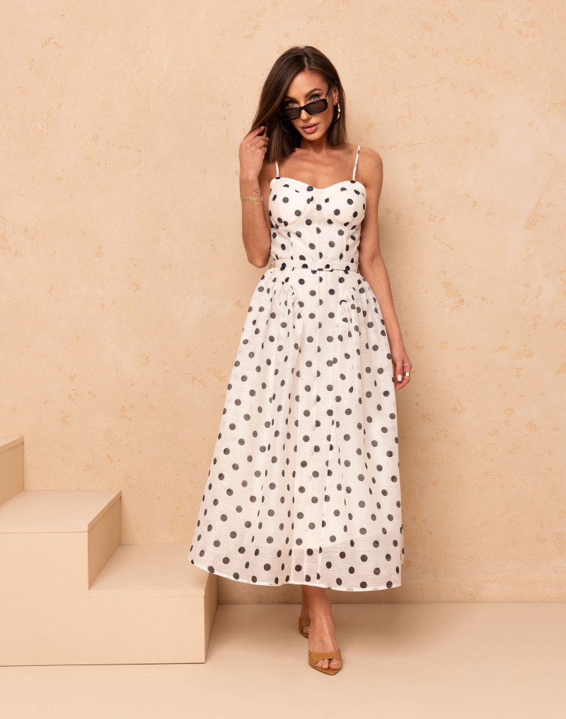Kobieca sukienka na cienkich regulowanych ramiączkach, która zachwyca ponadczasowym wzorem w grochy. Dopasowana góra pięknie podkreśla sylwetkę, a rozkloszowany dół dodaje lekkości i swobody. Zapinana na zamek po boku.Z tyłu na plecach znajduje się wszyta guma , która pozwala idealnie dopasować fason do figury. Idealna na letnie dni, wakacje i casualowe stylizacje.Podszewka.Pasek w zestawie.