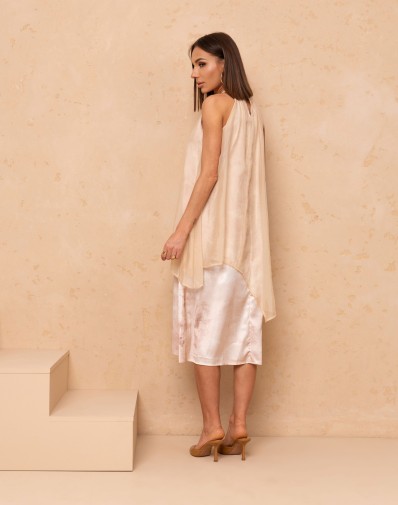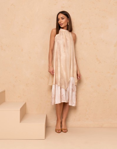 Lekka i kobieca sukienka bez rękawów wykonana dwóch warstw tkaniny.Od spodu materiał dłuższy w delikatny,subtelny wzór.Z Wierzchu transparentna tkanina o krótszej długości.Brak rękawów, zapięcie z tyłu na szyi na guzik. Idealna zarówno na specjalne okazje.Nadaje lekkości i kobiecości.Świetnie sprawdzi się z wysokimi szpilkami. Klasyczny fason i neutralny kolor sprawiają, że to must-have w każdej garderobie na letnie dni.