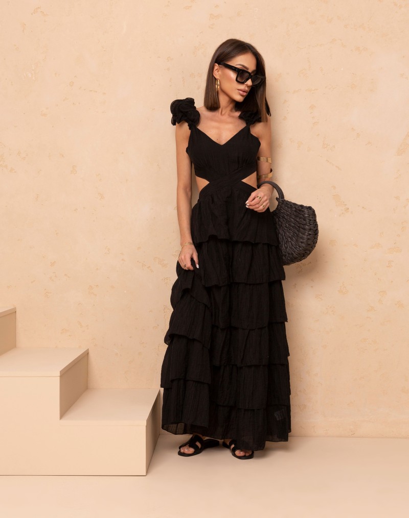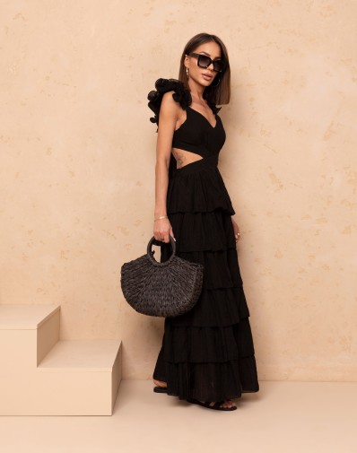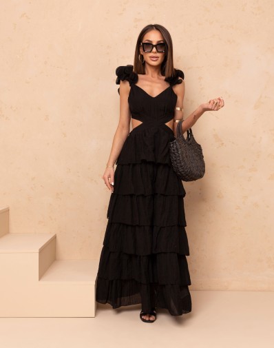 Zmysłowa i lekka sukienka maxi z efektownymi, warstwowymi falbanami, które pięknie układają się w ruchu. Model z gumką w pasie podkreśla talię, a wiązanie na szyi i odkryte plecy dodają kobiecego charakteru. Subtelne wycięcia po bokach oraz delikatny dekolt w szpic nadają całości wyjątkowej lekkości. Idealna na letnie dni i wieczorne wyjścia