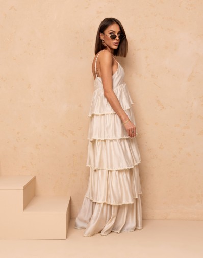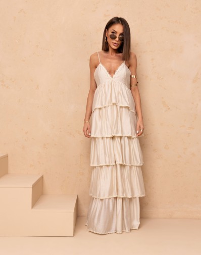 Sukienka Maxi z Falbanami na Ramiączka Ecru QDD618