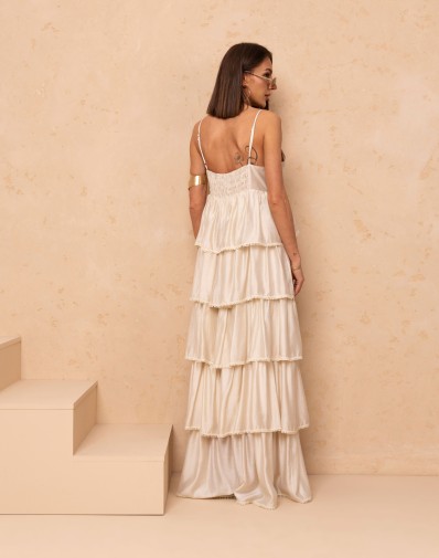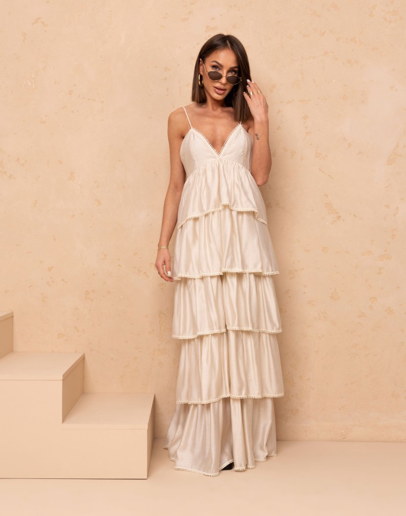 Zwiewna sukienka maxi w beżowym kolorze, idealna na lato i wakacyjne stylizacje. Model na cienkich, regulowanych ramiączkach zapewnia wygodne dopasowanie, a wszyta z tyłu guma pięknie podkreśla sylwetkę. Warstwowe falbany nadają lekkości i sprawiają, że sukienka efektownie układa się w ruchu.
