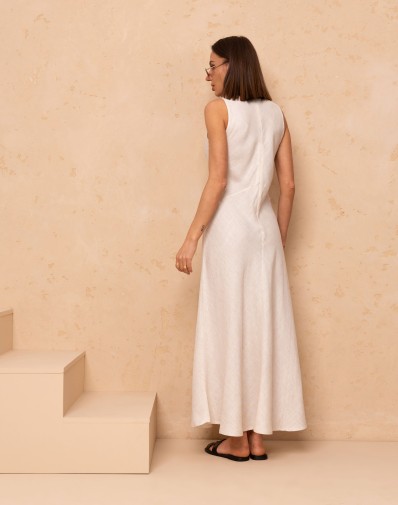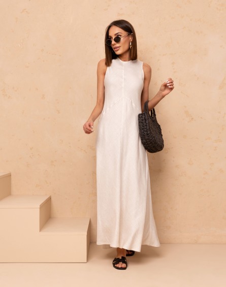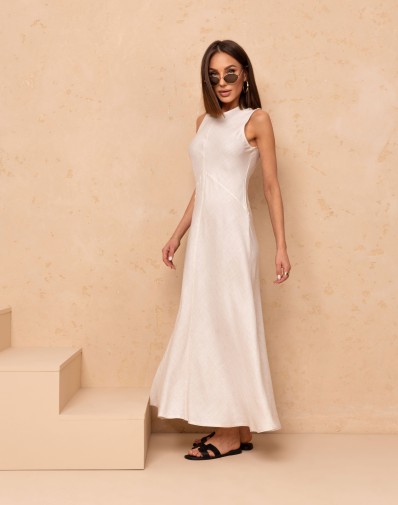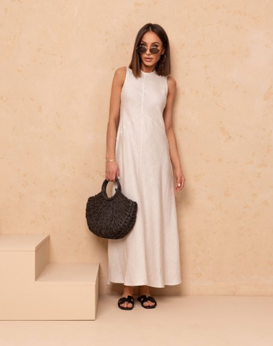 Elegancka sukienka maxi w jasnym,neutralnym odcieniu, o minimalistycznym kroju. Bez rękawów, z zabudowanym dekoltem i subtelnym zapięciem z tyłu, pięknie układa się na sylwetce. Prosty fason z delikatnym rozszerzeniem ku dołowi sprawia, że jest idealna zarówno na co dzień, jak i na bardziej eleganckie okazje.