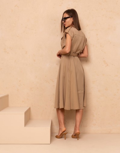 Stylowa sukienka koszulowa o długości midi w modnym beżowym kolorze. Zapinana na guziki, z krótkim rękawem oraz praktycznymi kieszeniami. W zestawie pasek podkreślający talię, który nadaje sylwetce kobiecego kształtu. Idealna na co dzień, do pracy i letnie wyjścia.