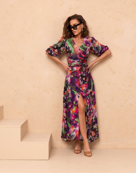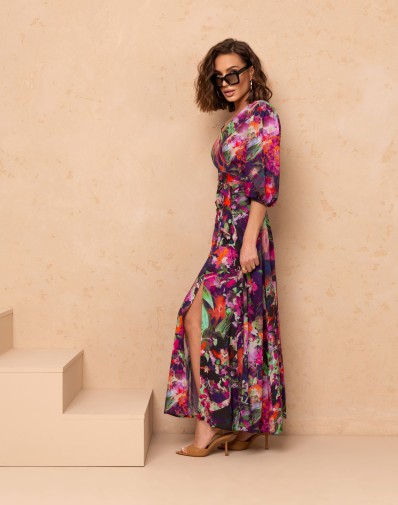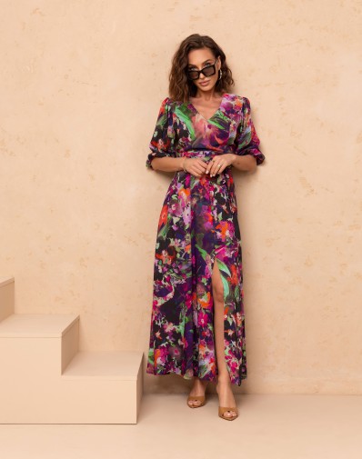 Elegancka sukienka o kwiatowym wzorze to idealny wybór na wyjątkowe okazje.Zwiewny i delikatny materiał .Model z dekoltem V pięknie podkreśla szyję i dekolt, a bufiaste rękawki dodają całości subtelnego uroku i kobiecości. Sukienka zapinana jest na kryty zamek z tyłu.Kieszenie na bokach .W zestawie szarfa dzięki której można jeszcze bardziej podkreślić talię.Rozszerzany ku dołowi krój zapewnia swobodę ruchów i wygodę noszenia. Dodatkowo, delikatny rozcięcie z przodu na wysokości łydek dodaje sukience lekkości i subtelnej zmysłowości. To wyjątkowa propozycja dla kobiet ceniących styl, komfort i elegancję.Dodatkowo szarfa do przewiązania w tym samym wzorze .