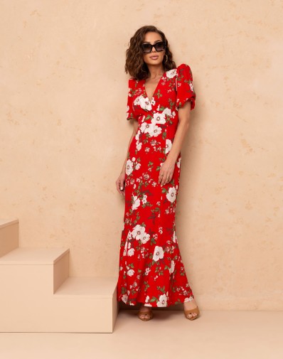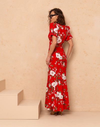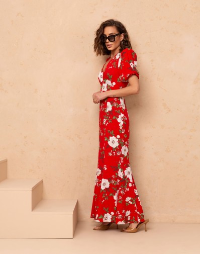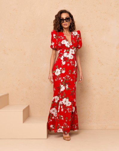 Elegancka sukienka maxi o kobiecym kroju. Model z dekoltem w kształcie litery V oraz subtelnymi zakładkami na biuście, które podkreślają sylwetkę. Rękaw o długości przed łokieć, delikatnie bufiasty, zakończony gumką.Talia została zaakcentowana szerokim pasem, który modeluje figurę. Dół sukienki w kształcie rybki pięknie układa się podczas ruchu, nadając całości lekkości i eleganckiego charakteru.Idealna propozycja na wyjątkowe okazje.