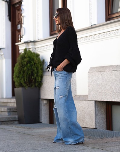 Sweterek o wyjątkowym kroju wiązanym na trzy kokardki, który dodaje uroku i oryginalności. Wykonany z przyjemnego w dotyku materiału, gwarantuje komfort noszenia. Idealny wybór na chłodniejsze dni – świetnie sprawdzi się w codziennych i bardziej eleganckich stylizacjach.Domieszka wełny