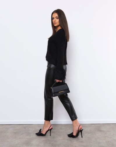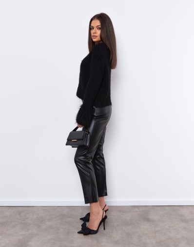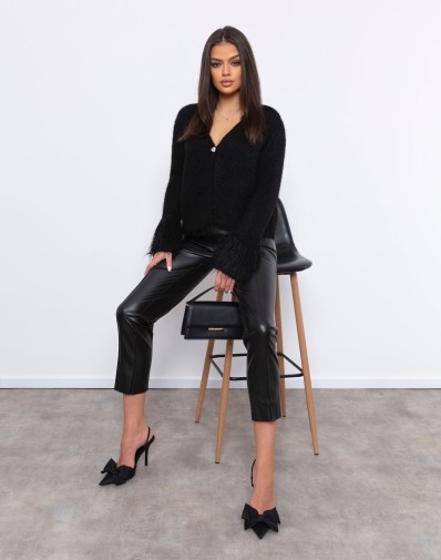 Sweterek o luźnym kroju zapinany na jeden guzik.Dodatkowym efektem są rękawy zakończone dłuższym włosiem. Wykonany z przyjemnego w dotyku materiału, gwarantuje komfort noszenia. Idealny wybór na chłodniejsze dni – świetnie sprawdzi się w codziennych i bardziej eleganckich stylizacjach.Domieszka wełny.